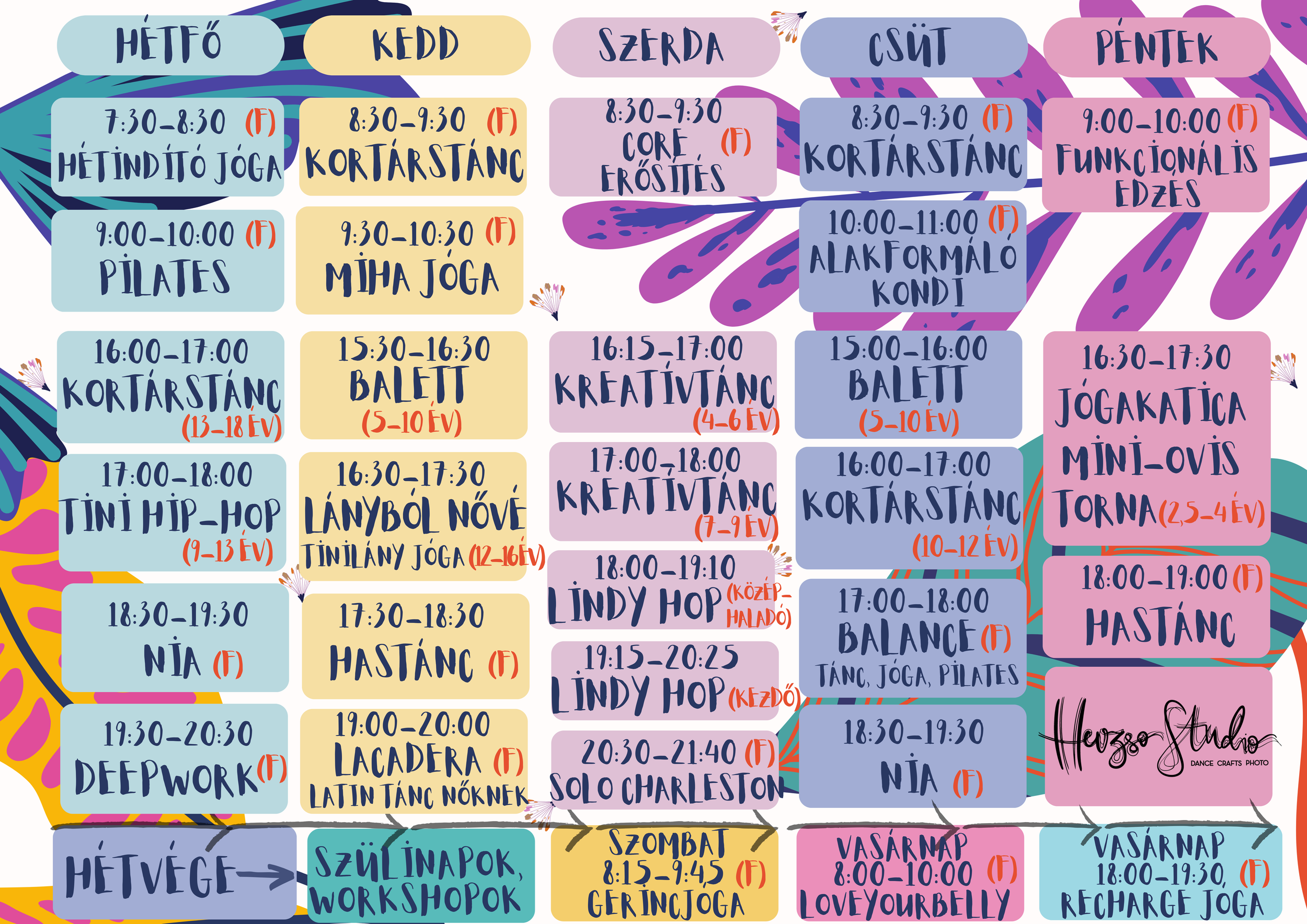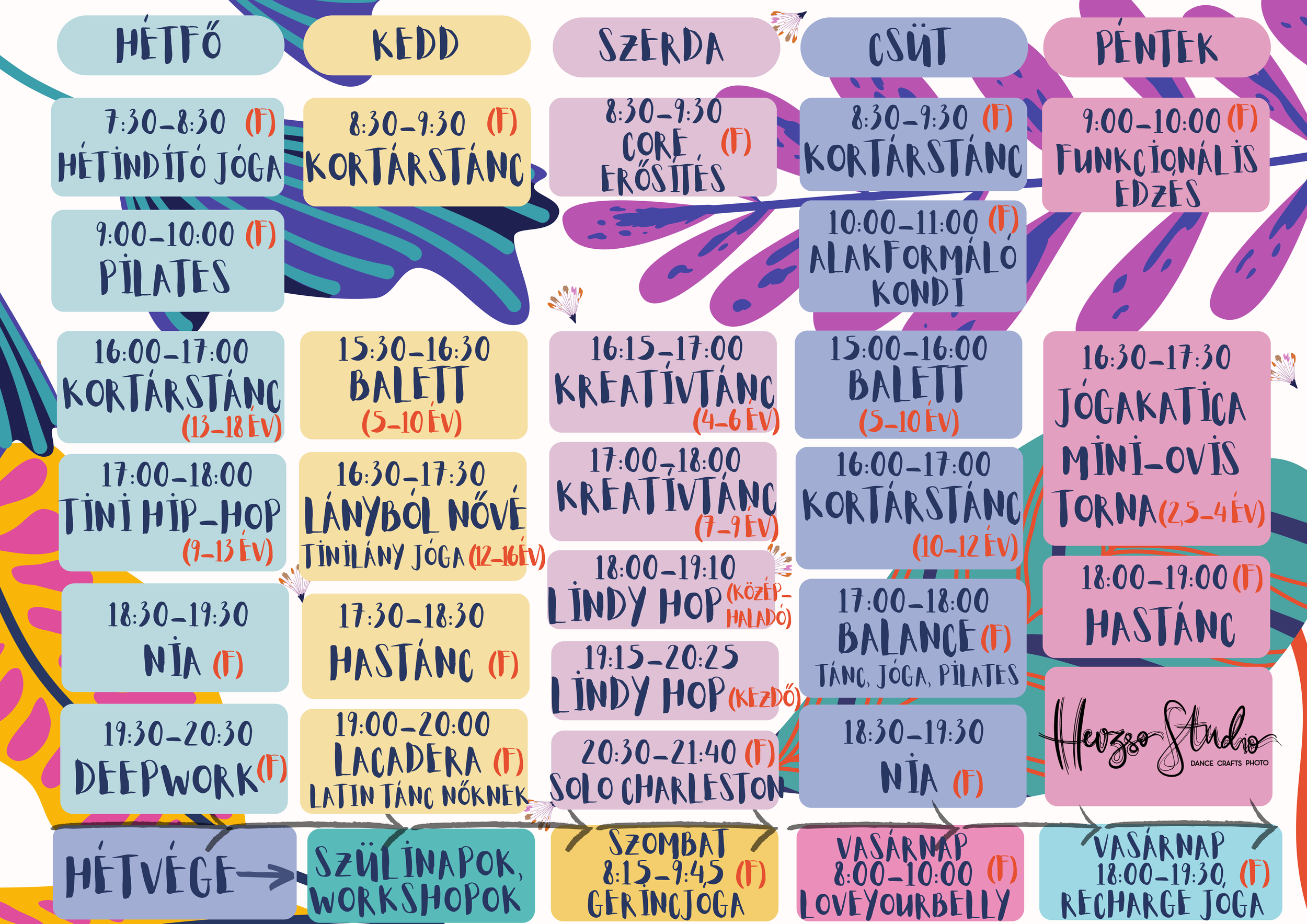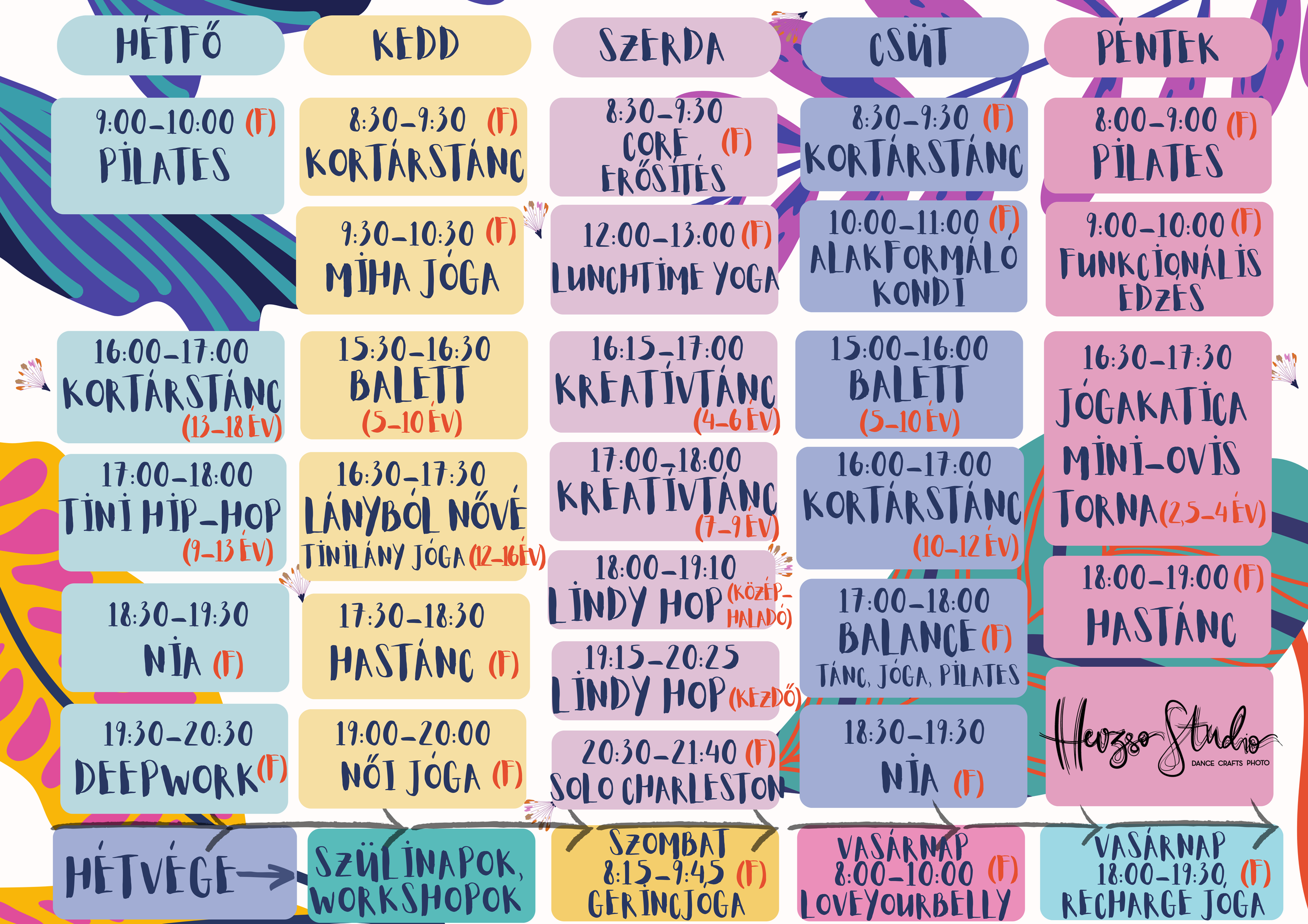 Gyermekfoglalkozásainkon az egyéniség kibontakoztatására fókuszálunk, a mozgás segítségével a gyermekeket önmaguk megismerésére, elfogadására neveljük; játékosan, felesleges korlátok nélkül. Ugyanerre a filozófiára épülnek tiniknek szóló óráink, ám ezek a mozgás magasabb szintű, önállóbb koordinációjára is tanítják a fiatalokat. Felnőtt mozogni vágyók kondíciójuknak és egyéniségüknek megfelelően választhatnak óratípust.